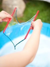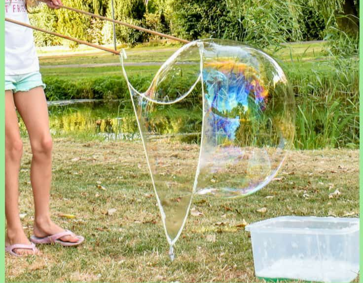 Отдельное удовольствие для детей и взрослых - пускать огромные мыльные пузыри. Для выдувания нужно сделать палки с натянутой на них веревкой и жидкость для больших пузырей.