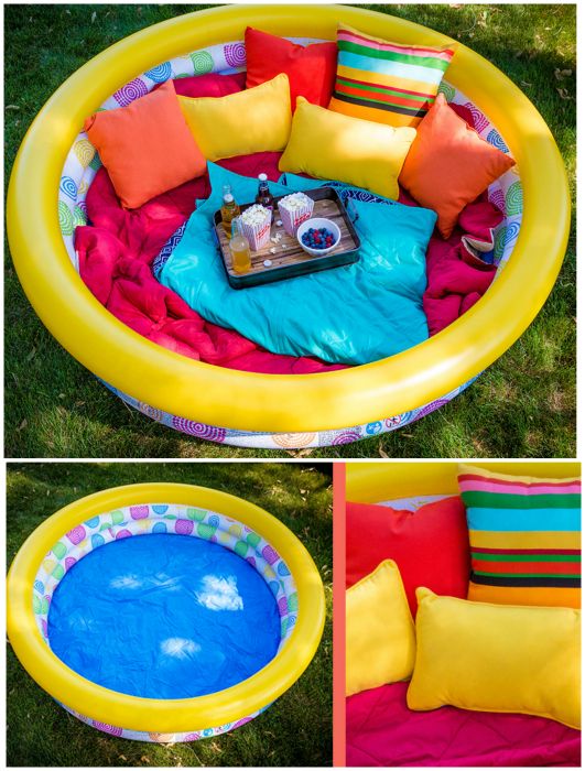 Игры на улице. В солнечную теплую погоду на улице в качестве занятия можно сделать малышу полосу препятствий, играть в разные подвижные игры, играть с мячом. Если же малышу не хочется активной игры, ему может приглянуться мягкое гнездо для отдыха, которое можно сделать в надувном бассейне, или свой шалаш (самая простая конструкция может быть создана при помощи двух простыней, защепленных на бельевую веревку). Эти уютные места подойдут для спокойных занятий с игрушками и релаксации.