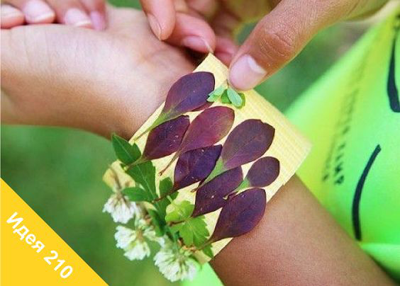 Украшения, короны и маски из цветов. Детям часто любопытно поиграть с кусочком скотча или изоленты, пробовать, как он пристает и отстает от разных поверхностей, прилеплять на него что-нибудь. Если сделать из малярного скотча браслет на руку маме или малышу, можно во время прогулки собрать и приклеивать на него цветы и листочки - получится летнее украшение. Таким же способом, используя двусторонний скотч, можно сделать удивительную летнюю корону или маску.