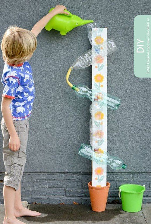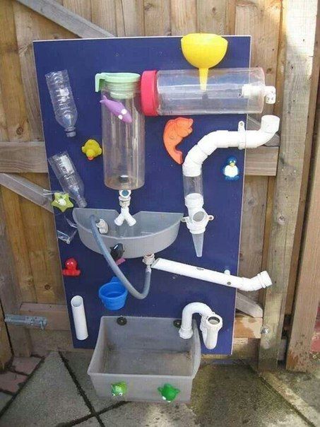 Игры с водой. Еще немного идей про то, как можно разнообразить игры летом. Можно сделать на участке канал для игрушечных лодок из фольги, уложенной в канавку, подавать в него воду можно при помощи шланга для полива. Из пластиковых бутылок, воронок, обрезков стройматериалов, шлангов, можно сделать систему для переливания воды - такие игры имеют своих "фанатов" среди малышей, готовых проводить много времени, наливая воду и прослеживая, как она лабиринтами стекает вниз.