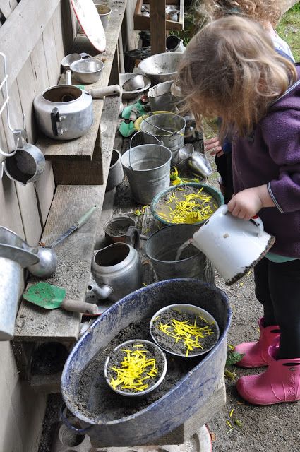 Детские уличные кухни. С английского языка название таких игр с песком, водой и травой переводится как "игры с грязью". Разрывание листочков на мелкие части для "салата", замешивание совком песочной "каши" и лепка руками песочных "котлет" - уютная сюжетная игра, помогающая развивать навыки мелкой моторики и игры "понарошку".